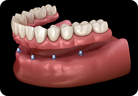 Implant dentures combine the lifelike aesthetic of traditional dentures with dental implants, which are small, titanium posts that are surgically placed below the gumline and into the jawbone to restore the root structure of missing teeth. Depending on the location of your missing teeth, we may opt to attach a complete denture to anywhere from four to eight dental implants, or a combination of bridges and free-standing crowns to dental implants to replace missing teeth throughout the arch.
